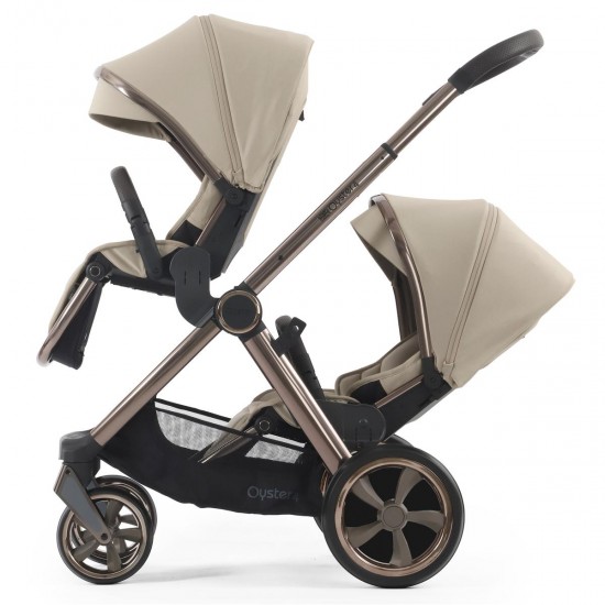 The Oyster 4 stroller has 8 approved tandem configurations for twins or close-in-age siblings when using the Oyster 4 Tandem Adaptors (includes wheel guards). Multi Car Seat Adaptors are required when using the Oyster Capsule Infant Car Seat (sold separately).